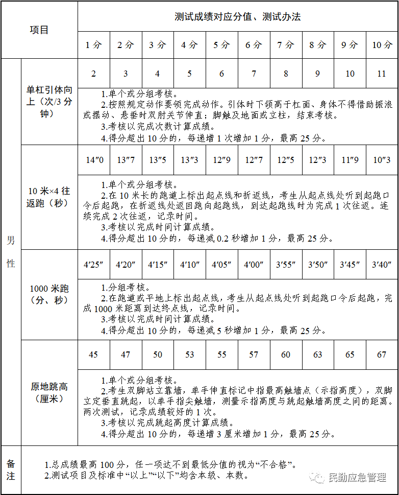 1.体能测试。满分100分。分单杠引体向上、10米×4往返跑、1000米跑、原地跳高四个项目,具体参照《消防员招录体能测试项目及标准》(见附件)执行,任一项达不到最低分值的视为不合格。